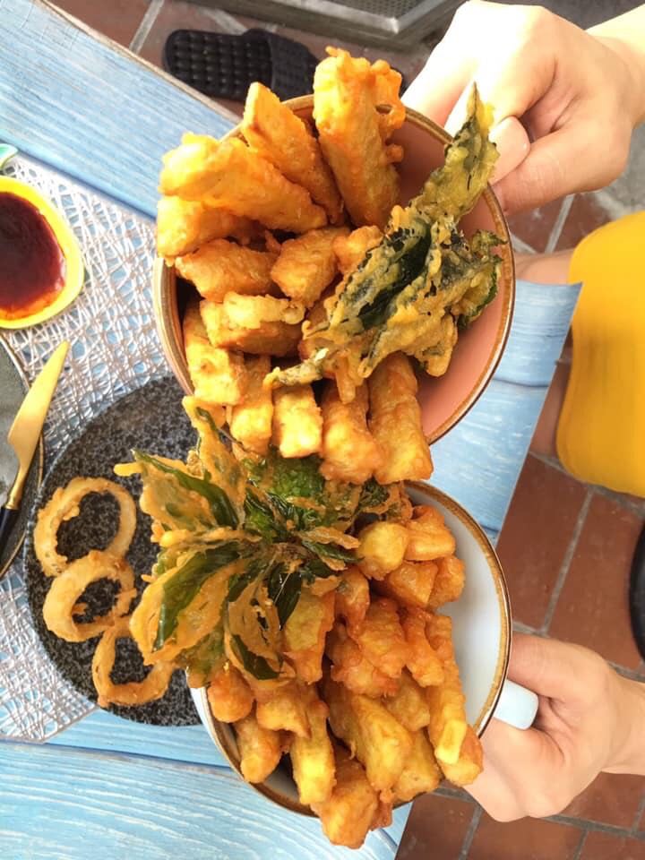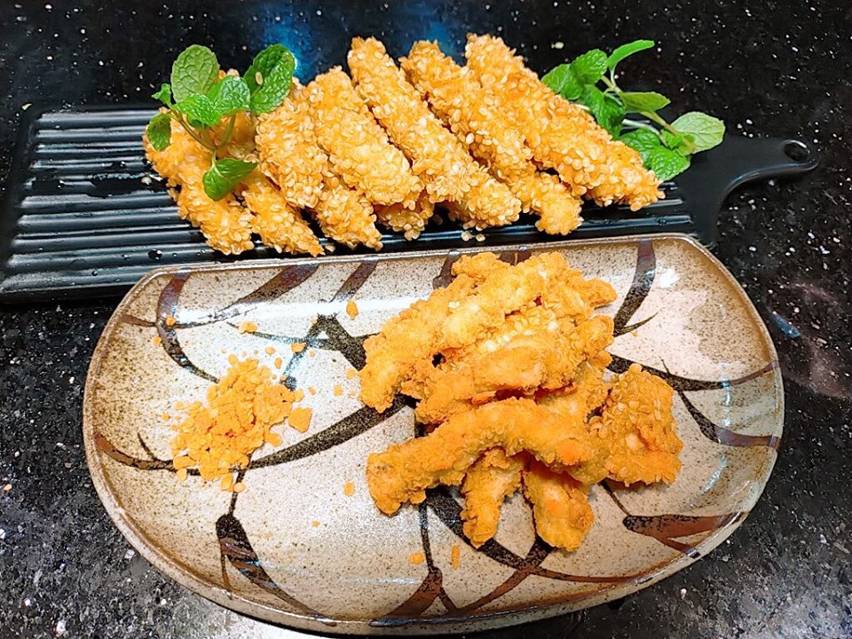 * Ngoài chiên gà, cá, thịt, tôm hải sản…Bột chiên Karaage còn chiên được tất đậu non và tất cả các loại ra củ quả…