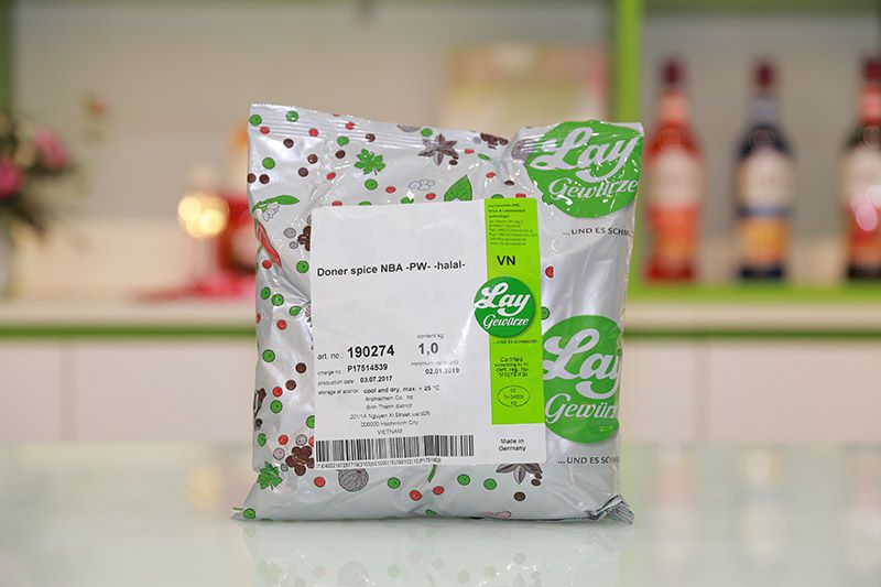 Bột gia vị Doner Kebab nhập khẩu Đức: Là những sản phẩm sạch, thân thiện trong bữa ăn hàng ngày của mỗi gia đình như: Ớt, hành, tỏi, dextrose ( từ ngô, lúa, mì), thảo mộc, protein thực vật thủy phân, muối, dầu cọ hydro hóa toàn phần, chất đông vón (551) để có thể bảo quản gia vị tốt hơn. Bột gia vị Doner Kebab mang lại hương vị chuẩn bánh mỳ Doner kebab Thổ Nhĩ Kỳ.
