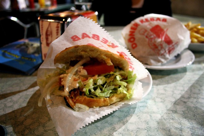 London, Anh: Thịt cừu, gà hoặc bò được thái mỏng, kẹp giữa bánh mì pita cùng cà chua, dưa chuột, dưa góp, ớt, bắp cải, thêm thật nhiều tỏi và tương ớt. Bánh được bán từ khoảng 21h tới 2h sáng. |